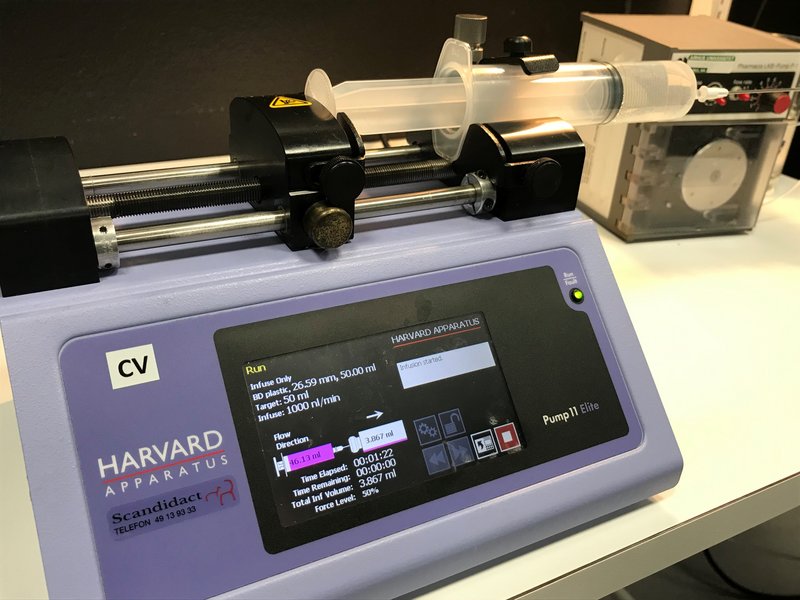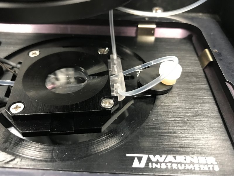 Perfusion is beneficial for many dynamic imaging experiments. In order to do this a RC-21BRFS perfusion imaging chamber and an injection pump is installed. In order to use it please contact The Bioimaging Team. Currently there is a controlable injection pump and a vaccum pump to remove perfusion solution. Future upgrades could be an automatic drug injection pump (can be controlled in software) and field stimulation control for electrophysiological imaging.