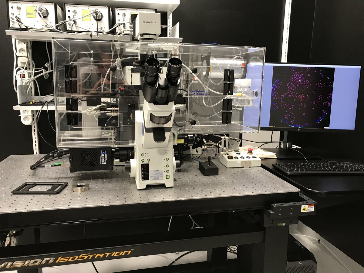 3 laser line TIRF system with a 150x (1.45 NA) dedicated TIRF lens and a TIRF condensor for independent laser control. Since the angle of each laser source is independently motorized, their penetration depths can be synchronized across each wavelength using cellSens software. The system is also equipped for live cell widefield fluorescence and ratiometric imaging.